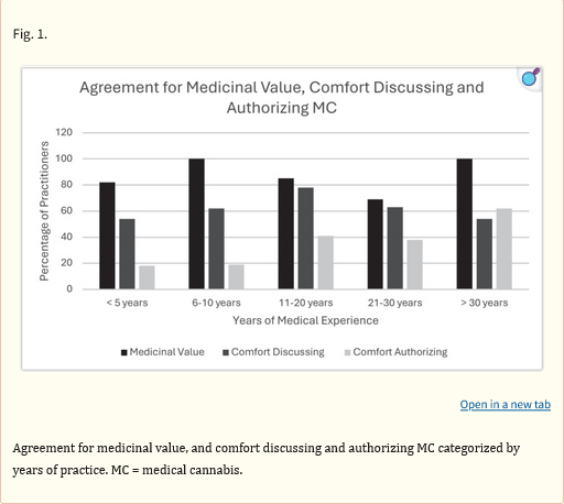 Un sondaggio strutturato basato sul web è stato distribuito ai membri della Canadian Association of Physical Medicine and Rehabilitation. Hanno risposto in 109. La maggior parte degli intervistati ha riconosciuto il valore medicinale della MC, con il 61% che si sentiva a suo agio nel parlarne, mentre solo il 31% si sentiva a suo agio nell’autorizzarla. Gli anni di esperienza lavorativa non hanno influito sulla facilità di discussione della MC, ma coloro con oltre 21 anni di esperienza hanno autorizzato la MC più frequentemente. È stata osservata una relazione significativa tra la sottospecializzazione e la prescrizione della MC; la maggior parte delle prescrizioni autorizzate riguardava il dolore neuropatico, il dolore muscoloscheletrico e la spasticità. La maggior parte degli intervistati ha concordato sul fatto che le facoltà di medicina e i programmi di specializzazione fornissero una formazione insufficiente sulla MC e che le linee guida governative e istituzionali rimanessero poco chiare.