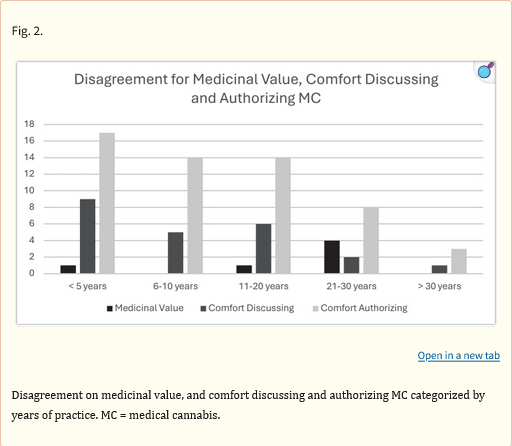 La letteratura precedente ha mostrato atteggiamenti contrastanti sull’uso della cannabis. Questo studio, insieme a studi condotti a New York (19), Israele (20) e Australia (21), mostra che i medici hanno generalmente atteggiamenti positivi nei confronti della cannabis, mentre i medici in Colorado (18) e Irlanda (22) hanno mostrato atteggiamenti complessivamente negativi. La stragrande maggioranza degli intervistati ha concordato sul valore medicinale della cannabis (Fig. 1), ma i fisiatri con meno esperienza si sono sentiti meno a loro agio nel parlarne e ancora più a disagio nell’autorizzarla, rispetto ai fisiatri con più esperienza (Fig. 2).