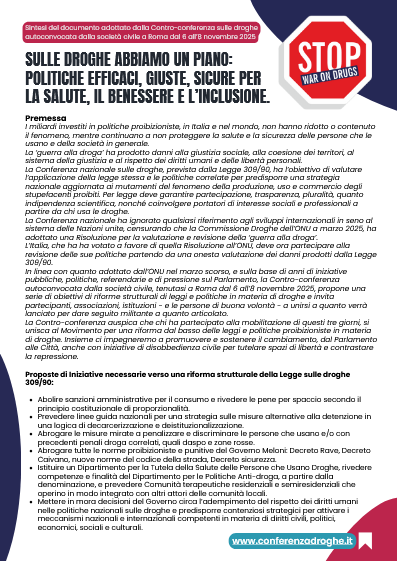 La Contro-conferenza – convocata da una vasta rete di organizzazioni della società civile – è nata come risposta politica a una Conferenza nazionale governativa chiusa, priva di ascolto e completamente scollegata dagli indirizzi internazionali. Nonostante l’Italia abbia votato a favore, a marzo 2025, della Risoluzione ONU che invita gli Stati a superare la “guerra alla droga”, la linea del Governo resta ancorata ai paradigmi repressivi introdotti trent’anni fa dalla legge 309/90.