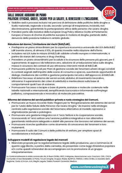La Contro-conferenza sulle droghe ha lanciato un documento politico che propone una riforma strutturale della legge 309/90, a partire dal superamento della guerra alla droga e dalla centralità dei diritti, della salute e della riduzione del danno.