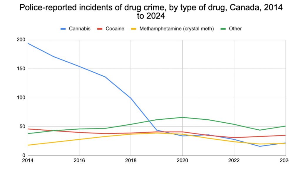 A dimostrazione di questo cambiamento, nel 2014 in Canada si sono verificati quasi 70.000 reati legati alla cannabis, pari a due terzi (66%) di tutti i reati legati alla droga. Dieci anni dopo, i reati legati alla cannabis rappresentavano solo il 17% di tutti i reati legati alla droga.