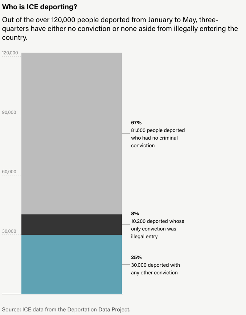 Le persone senza alcuna condanna penale rappresentano i due terzi delle oltre 120.000 persone espulse tra gennaio e maggio. Per un altro 8%, l’unico reato sulla loro fedina penale era l’ingresso illegale negli Stati Uniti. Solo il 12% circa è stato condannato per un crimine violento o potenzialmente violento. Questi numeri contraddicono le continue affermazioni dei funzionari secondo cui le forze dell’ordine si stanno concentrando sui “peggiori tra i peggiori” criminali.