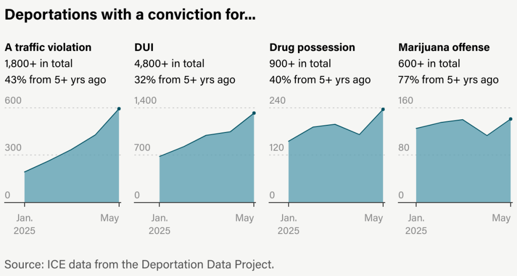 Il numero di persone espulse solo per reati non violenti – come violazione di proprietà privata, mancata comparizione in tribunale, reati legati alla marijuana, furto nei negozi e violazioni del codice della strada – è quasi raddoppiato da gennaio.